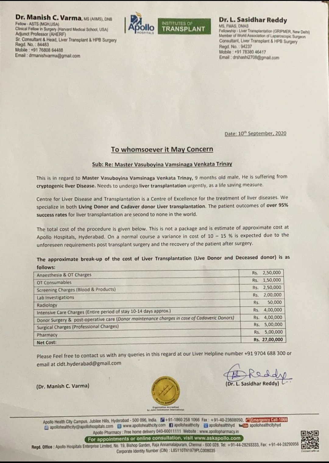 Until now they have tried getting treated in different Government hospitals in AP, Telangana, Chennai and Bangalore but non of the government hospitals ensured them that they will be able to take care of the Transplantation. Most of them referred for private hospitals as this is critical surgery.