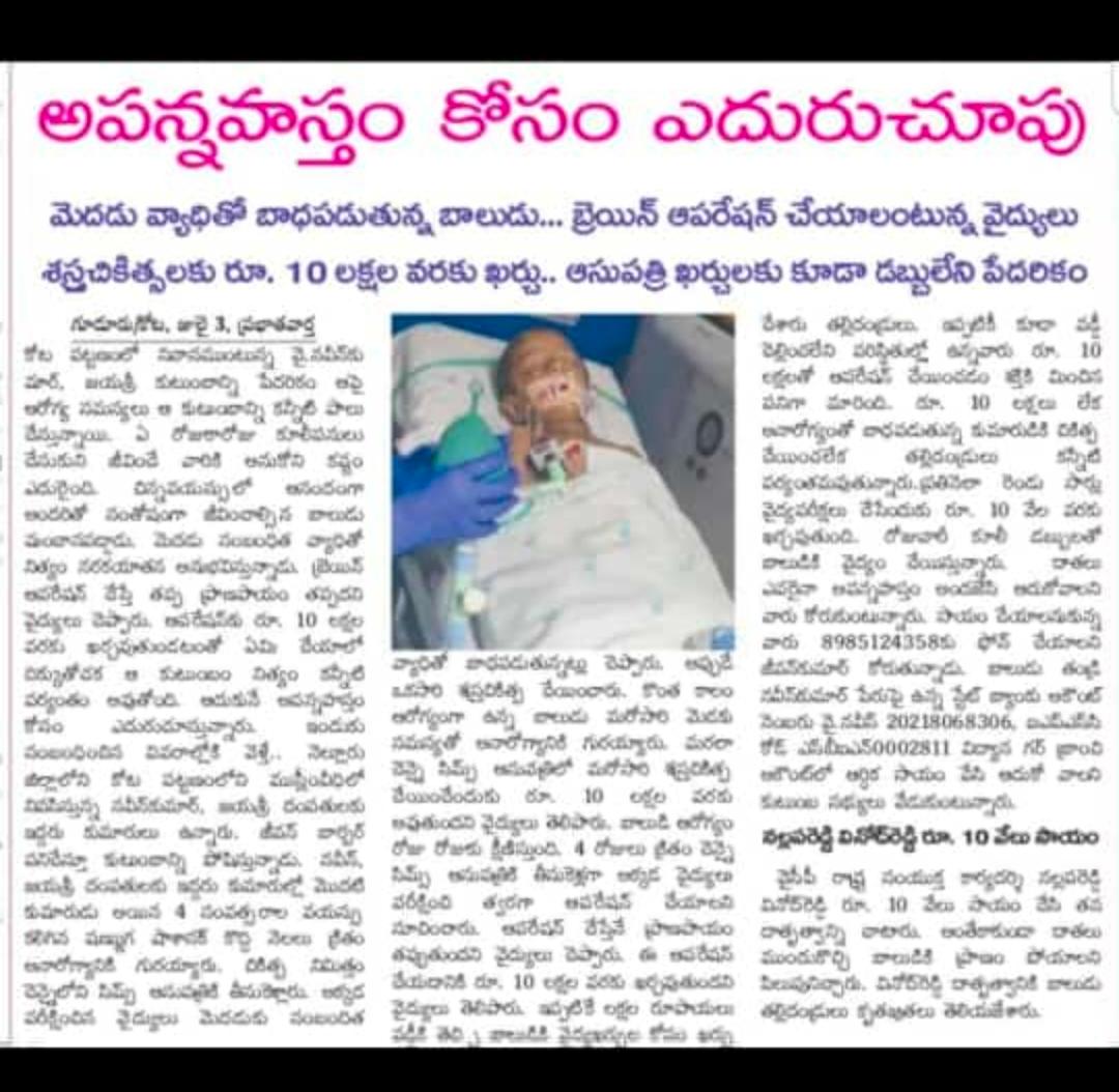 I work as a carpenter and wooden cutter in construction field and we live in Nellore. My family condition is very poor and we have shared this news to everyone. Still we need your support, help and prayers for my kid. Please come forward and do the needful to my little kid.