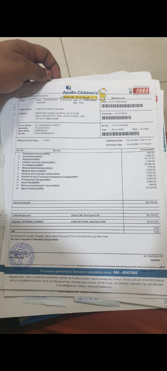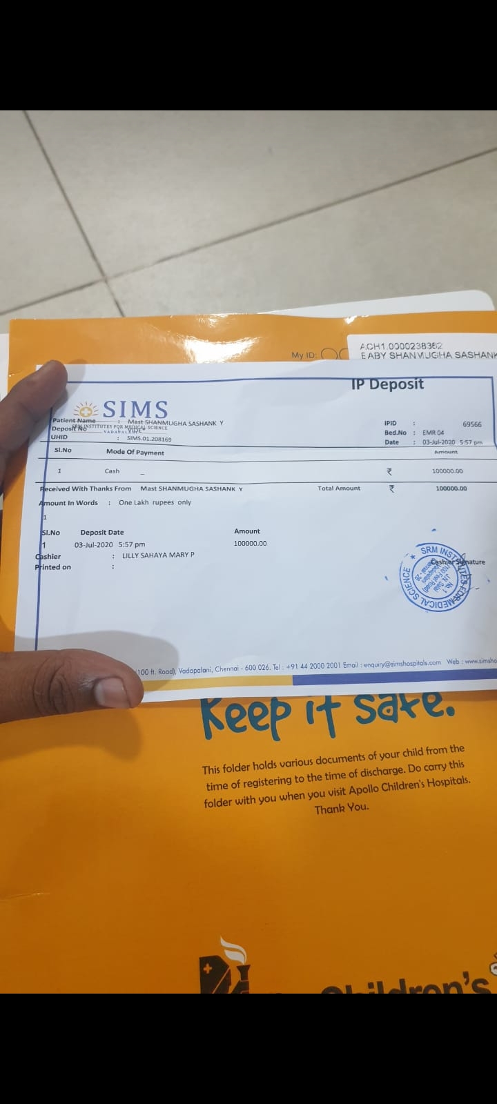 My son SHANMUGHA SASHANK 3years old and suffering with serious injuries in Neck and brain. He is undergoing treatment in SIMS HOSPITAL.We have already changed 2 hospitals, the previous one was APOLLO. We do not have enough money to continue the treatment at APOLLO.Now the kid is being treated in SIMS HOSPITAL. We are spending 40000-50000 everyday and if don't pay the money they're not giving treatment to the kid. We tried almost everywhere for the amount and many people have helped us and got around 2-3lacs but still we need around at least 700000 for my kid's treatment.